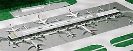 werden können Die 5. Bauetappe Nachdem der Flughafen in den siebziger (Terminal B mit Fingerdock) und achtziger (Fingerdock A mit neuen Tower) Jahren sein Aussehen markant verändert hatte, wird die Anlage im nächsten Jahrzehnt erneut einen wesentlich andern Charakter erhalten. Am meisten wird dabei das Dock Midfield ins Auge springen, das nördlich der Piste 28-10 und zwischen die Pisten 34-16 und 32-14 zu liegen kommt. Je nach Flugzeugtyp werden damit zusätzlich 19 bis 27 Standplätze verfügbar. Zwischen den heutigen Fingerdocks A und B, unmittelbar vor dem ursprünglichen Abfertigungsgebäude aus den fünfziger Jahren, wächst das neue Airside Center in die Höhe. Dort treffen abfliegende, ankommende und durchreisende Fluggäste aufeinander. Ihnen wird eine grosse Palette von Dienstleistungen wie Restaurant, Läden und Lounges zur Verfügung stehen. Eine Mini-U-Bahn Zwischen Airside Center und Dock Midfield wird alle zweieinhalb Minuten die unterirdische Flughafenmetro verkehren. Zwei Minuten wird die Fahrt des mit Seilzügen angetriebenen Zuges dauern, der auf einem Luftkissen gleitet. Die beiden Wagen pro Einheit bieten insgesamt 184 Personen Platz. Das System bewährt sich bereits in Cincinnati (USA) und Narita (Japan). Parallel dazu verläuft eine unterirdische, vierspurige Strasse von knapp einem Kilometer Länge. Auf ihr zirkulieren Dienst-, Fracht- und Cateringfahrzeuge. Angegliedert sind ein Gepäcktunnel, durch den das Passagiergepäck von der neuen Sortieranlage östlich des Terminals A zu den Flugzeugen gelangt, und ein weiterer Kanal für Strom, Wasser, Fernwärme und elektronische Daten. Neue Check-in Schalter Es ist ein erklärtes Ziel, den öffentlichen Verkehr zu fördern. Dieser Vorgabe dient auch ein neuer Bahnhofterminal direkt über den SBB-Gleisen. Dort entstehen 60 neue Check-in-Schalter. Damit können mit dem Bus oder der Bahn anreisende Passagiere ihr Gepäck ohne lange Fussmärsche einchecken und unbelastet zu ihrem Terminal gehen. Gleichzeitig wird die Kapazität des Plaza mit Einkaufsläden nahezu verdoppelt. Immer mehr entwickelt sich der Flughafen zu einer eigentlichen Stadt. Bereits heute ist er Arbeitsort für rund 17000 Menschen, die in 160 Firmen und Amtsstellen ihr Einkommen finden. |